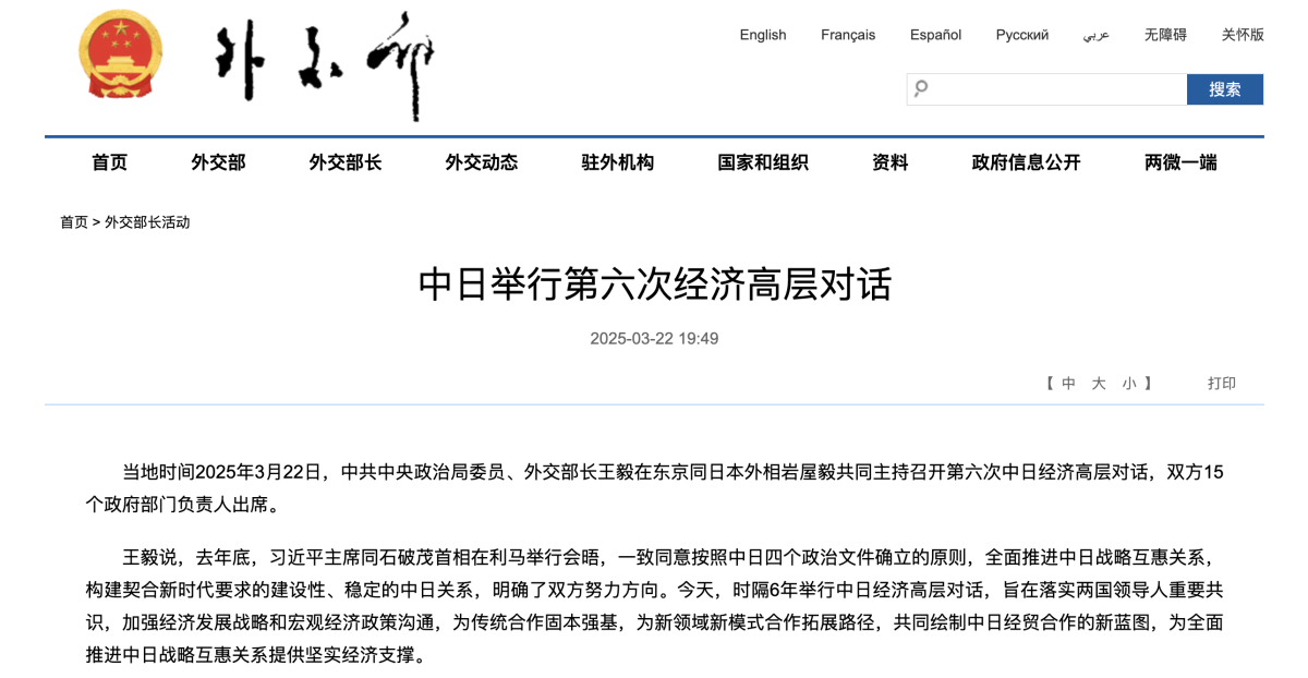 【點新聞報道】據外交部網站消息,當地時間2025年3月22日,中共中央政治局委員、外交部長王毅在東京同日本外相岩屋毅共同主持召開第六次中日經濟高層對話,雙方15個政府部門負責人出席。