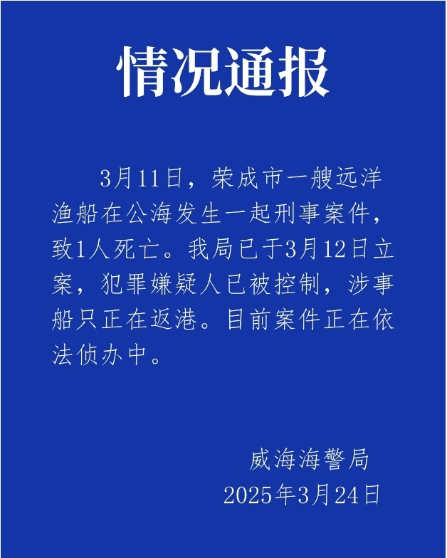 【點新聞報道】3月24日深夜,山東威海海警局發布情況通報。通報指,3月11日,榮成市一艘遠洋漁船在公海發生一起刑事案件,致1人死亡。
