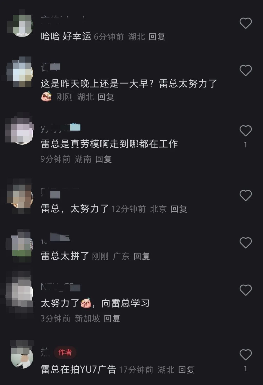 有網友在社交平台上發文,「好幸運,偶遇雷總在武大拍廣告」,不少評論感嘆「雷總真是勞模啊走到哪都在工作」「雷總太努力了」。