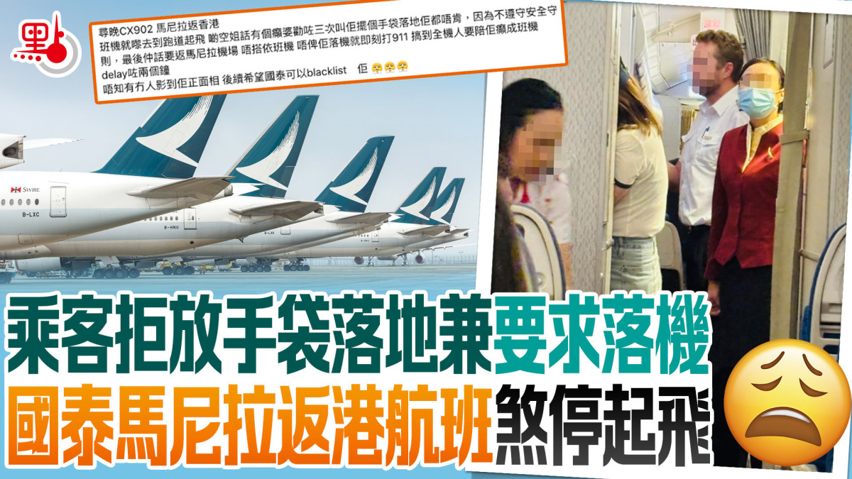 有網民在社交平台以「尋晚CX902,馬尼拉返香港」為題發文,指出:「班機就嚟去到跑道起飛,啲空姐話有個癲婆勸咗三次叫佢擺手袋落地佢都唔肯,因為不遵守安全守則,最後仲話要返馬尼拉機場,唔搭依班機,唔俾佢落機就即刻打911,搞到全機人要陪佢癲成班機delay咗兩個鐘,唔知有冇人影到佢正面相,後續希望國泰可以blacklist佢」。從其上載的照片可見,當時機上一男一女的機組人員,相信正在處理有關事宜,但照片未有拍攝到涉事乘客的容貌。