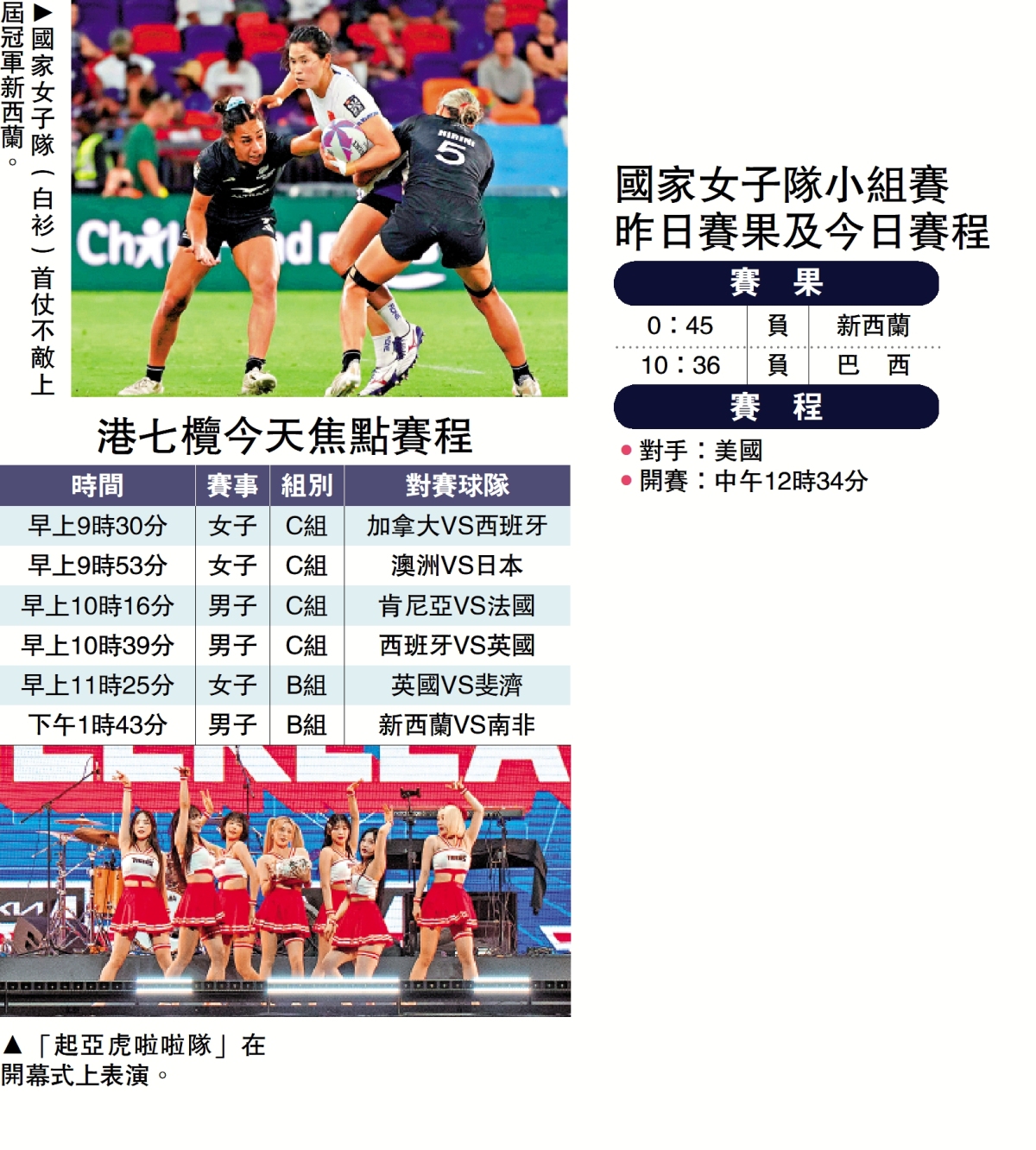 國家女子隊今屆時隔6年重返國際七欖系列賽,昨首仗先挑戰上屆冠軍新西蘭,開局就被對手打出一波19:0的攻勢。儘管國家隊多次作出戰術調整,但仍未能把握機會突破對手防線,最終以0:45不敵對手。