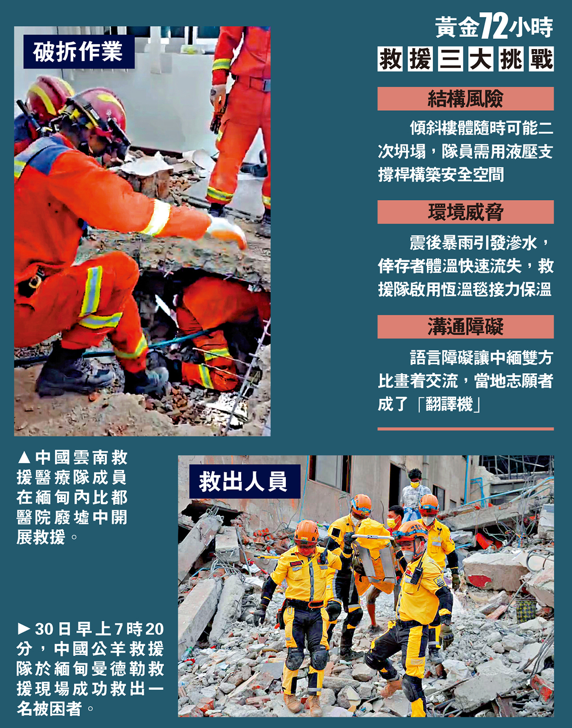 中國多支救援隊正在緬甸地震災區全力開展搜救,截至當地時間31日零時40分,已在當地救援力量配合下成功救出三名倖存者。