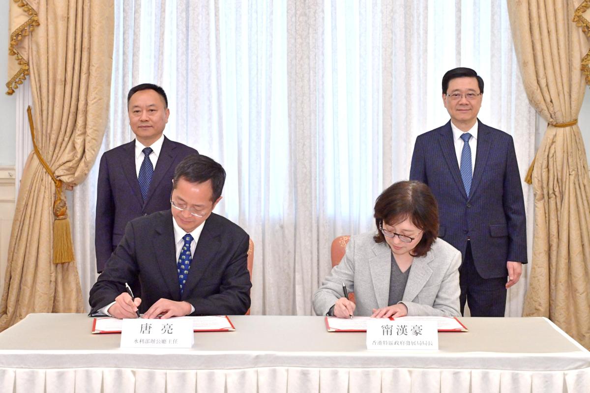 發展局局長甯漢豪和水利部辦公廳主任唐亮分別代表香港特區政府和水利部簽訂合作協議。合作協議將加強珠江河口及粵港界河治理與保護,促進防災減災、供水安全、規劃及專案建設管理、信息共享、人才培養、水利科技等領域合作。
