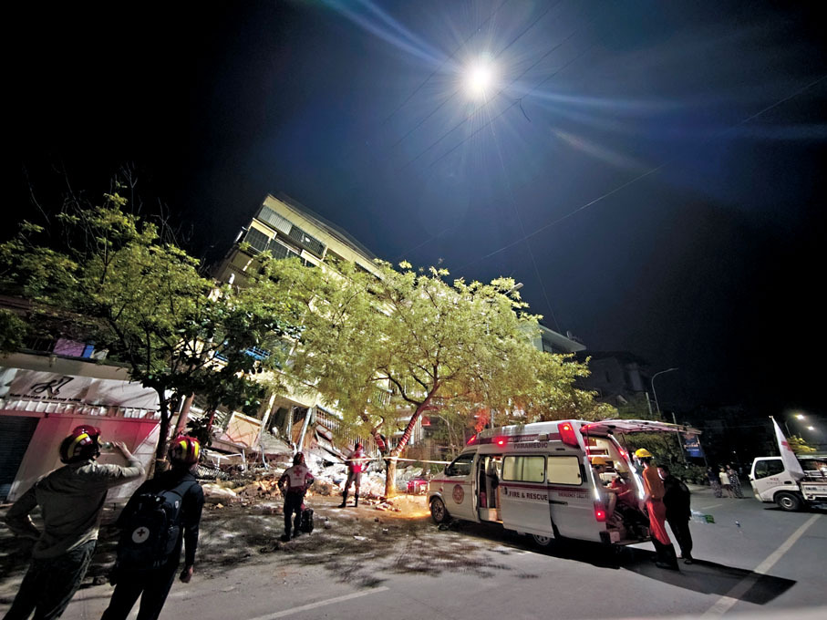 中國紅十字國際救援隊一行15人於3月31日一早抵達緬甸曼德勒市,隊員立即在該市開展破拆搜救、護理轉運、醫療救助和心理疏導等抗震救災工作。晚上7時10分,救援隊接到求助,在曼德勒68-41地區倒塌的六層樓中,一樓超市有一名22歲女生被壓。抵達現場後,救援隊發現這裏晚上斷電沒有照明,隊員立即開啟無人機照明。「China,非常棒!」當無人機飛上天空時,當地的百姓都在鼓掌。