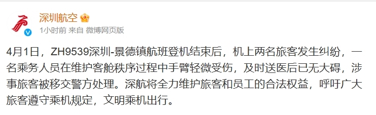 深圳航空今日(4月2日)在微博發文證實,涉事航班ZH9539「深圳-景德鎮」航班登機結束後,機上兩名旅客發生糾紛,一名乘務人員在維護客艙秩序過程中手臂輕微受傷,及時送醫後已無大礙,涉事旅客被移交警方處理。深圳航空表示,全力維護旅客和員工的合法權益,呼籲廣大旅客遵守乘機規定,文明乘機出行。