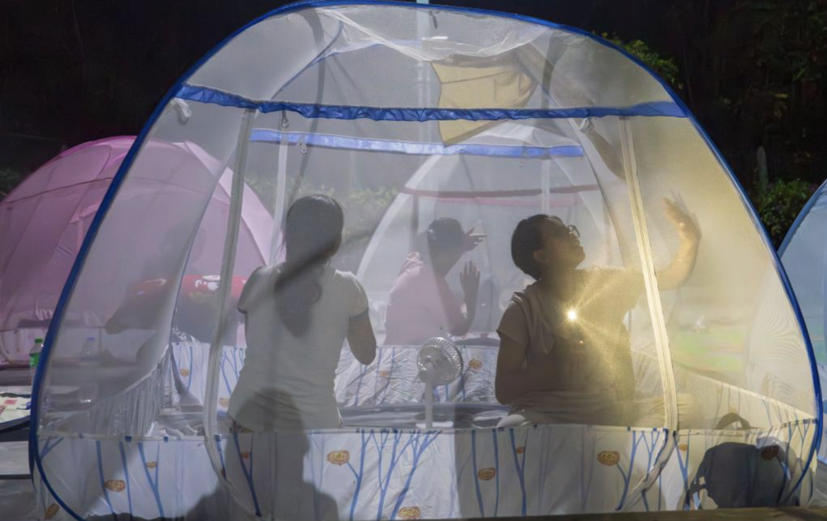 一名年輕的母親陪着一個四歲左右的小男孩,坐在路邊涼蓆上,拿着電蚊拍為孩子驅趕蚊蟲。小男孩安心地坐着,全神貫注地擺弄手上的物品。