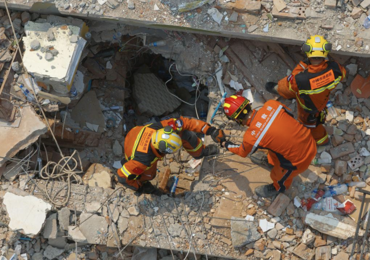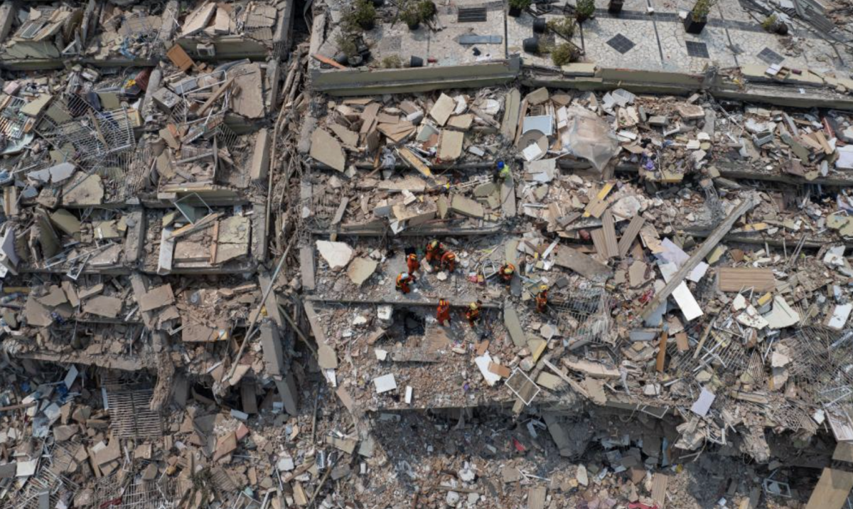 位於曼德勒市區的天空公寓是三棟11層的公寓樓群,其中兩座完全坍塌,另一座樓體5層以下發生坐沉垮塌。3月30日上午,當地救援人員在廢墟上探測到還有倖存者。中方救援隊隨即加入,與緬方一道開展工作,分批次進入廢墟試圖營救倖存者,展開了多輪搜救。