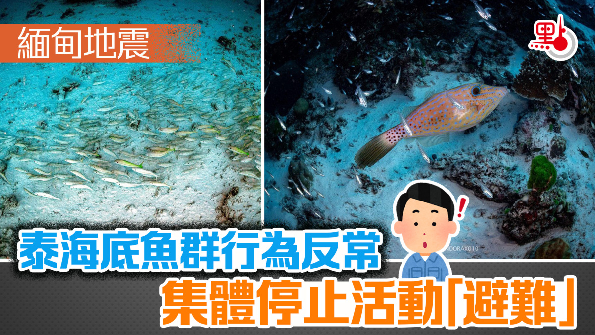泰國農業大學水產學院海洋科學系助理教授東恩(Thon Thamrongnawasawat)在Facebook發文,分享研究團隊在泰國西部斯米蘭海洋國家公園(Mu Ko Similan National Park)拍到魚群在地震時避難的情形。從照片可見,魚群原先在海中活躍地游動,但當地震發生時,魚群們突然停止活動,集體貼近海床。由於魚類白天活動力強,夜晚也只是個別休息,因此東恩分析,此情形很不尋常。