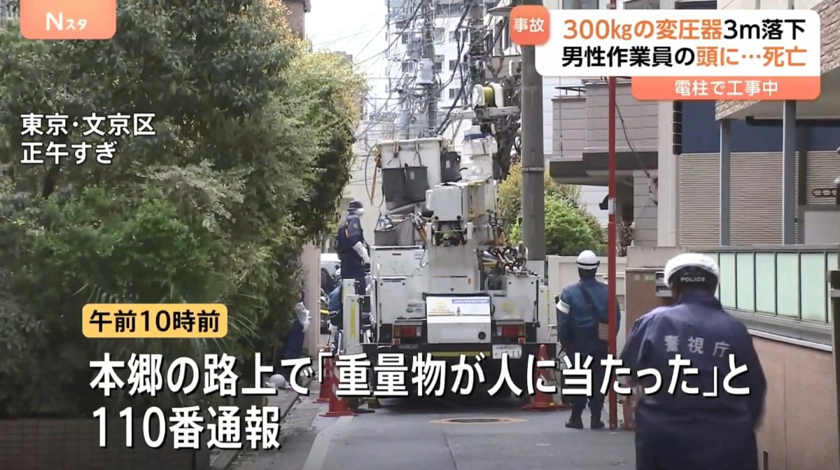 警視廳表示,當時另一名工人正搭乘高空作業車,要為一處電線桿安裝變壓器,但因不明原因導致300公斤重的變壓器從3米高空掉下,當場砸中在車斗上的54歲工人岩崎哲也,他雖有戴安全帽,但頭部仍遭到重擊當場失去意識。救護車獲報趕赴現場將他緊急送醫,不幸於4小時後宣告不治。