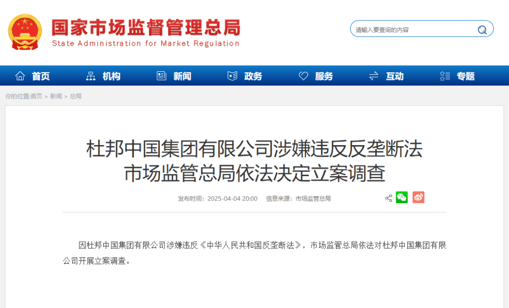 【點新聞報道】據國家市場監管總局今日(4日)公布,因杜邦中國集團有限公司涉嫌違反《中華人民共和國反壟斷法》,市場監管總局依法對杜邦中國集團有限公司開展立案調查。