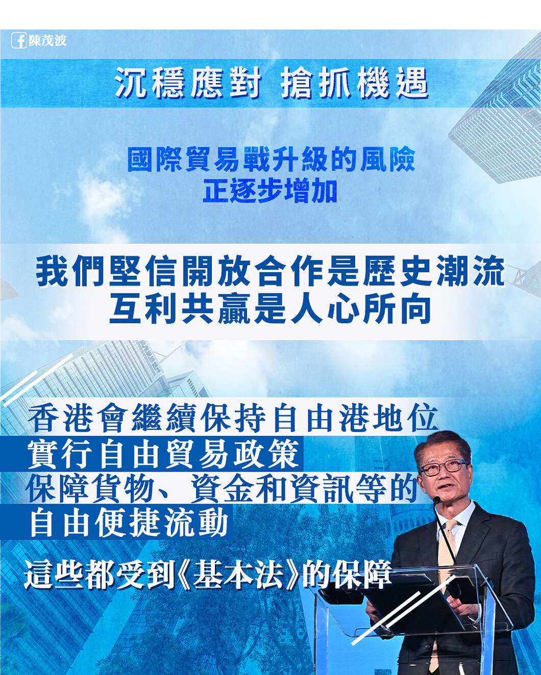 陳茂波表示,堅信開放合作是歷史潮流,互利共贏是人心所向。特區政府會繼續保持自由港地位,實行自由貿易政策,保障貨物、資金和資訊等的自由便捷流動,這些都受到基本法的保障。