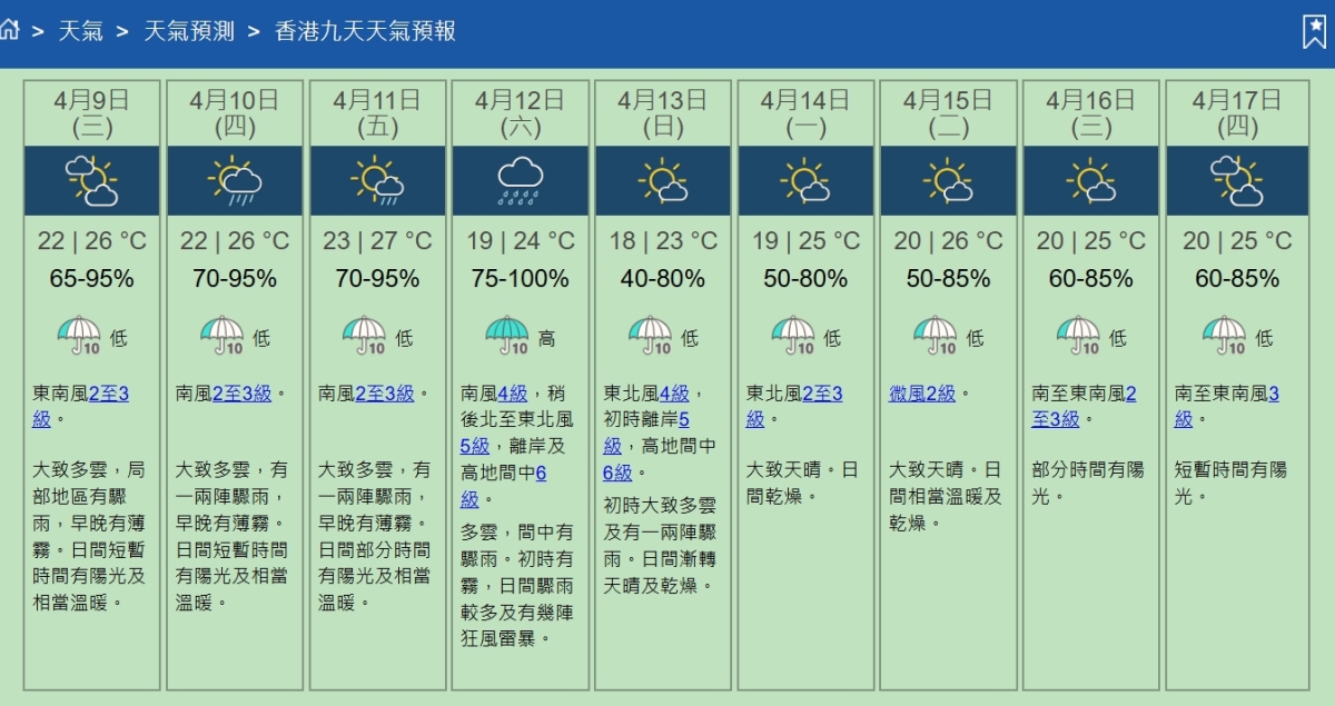 天文台預料,一股偏南氣流會在未來兩三日為廣東沿岸帶來潮濕及有薄霧的天氣,日間相當溫暖,周五(11日)部分時間有陽光。
