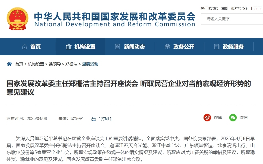 【點新聞報道】據國家發改委網站消息,4月8日早晨,國家發展改革委主任鄭柵潔主持召開座談會,邀請江蘇天合光能、浙江中基寧波、廣東領益智造、北京滴滴出行、山東歌爾股份等5家民營企業與會,聽取宏觀政策在微觀主體的落實情況及建議,聽取應對美加徵關稅的舉措及建議,聽取穩外貿、穩就業的意見及建議。國家發展改革委副主任鄭備出席會議。