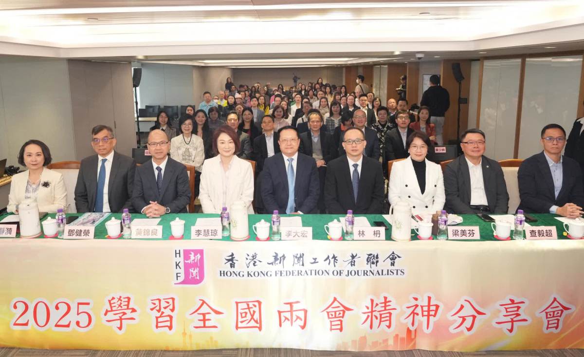 【點新聞報道】4月8日,香港新聞工作者聯會(新聞聯)舉行「2025學習全國兩會精神分享會」,邀請全國人大常委會委員李慧琼、港區全國人大代表梁美芬、林順潮、冼漢迪和黃錦良,全國政協委員鄧健榮、查毅超和盧永雄,新聞聯主席、全國政協委員李大宏及新聞聯常務理事、全國政協委員曾瀞漪一同出席會議,深入學習全國兩會重要精神,探討香港在中國式現代化建設中的角色與機遇。中央駐港聯絡辦宣傳文體部副部長林枬應邀出席。