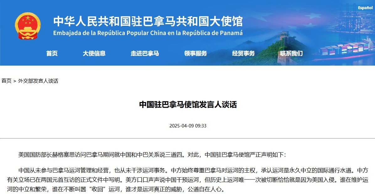 【點新聞報道】據中國駐巴拿馬使館網站消息,美國國防部長赫格塞思訪問巴拿馬期間,就中國和中巴關係說三道四。對此,中國駐巴拿馬使館發言人發布嚴正聲明。
