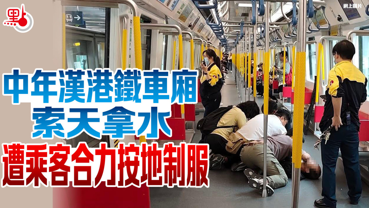 【點新聞報道】港鐵禁止乘客攜帶易燃液體進入車廂,惟昨日(11日)一名中年男子在屯馬綫一列車車廂,竟拿出一樽懷疑天拿水嗅聞,有乘客上前勸止,結果雙方衝突,中年漢終被制服,由警員押走。