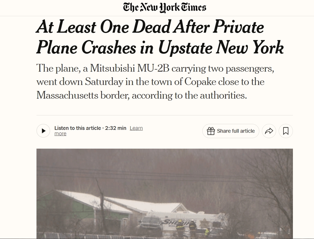 據悉,飛機原計劃飛往紐約州哈德遜附近的哥倫比亞縣機場。目前,尚不清楚是否有其他人員傷亡,也不清楚飛機墜毀的原因。