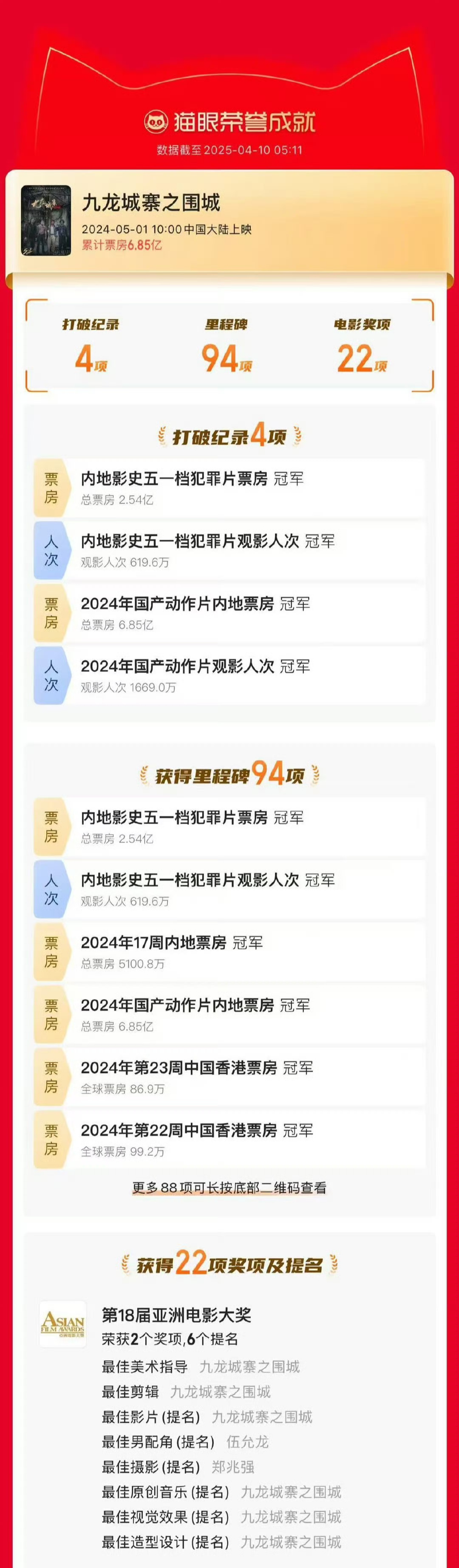 電影由古天樂、洪金寶、任賢齊、林峯、劉俊謙等主演,上映後曾引起全城熱話。據貓眼專業版數據,《九龍城寨之圍城》2024年5月1日首映,截至目前,全球累計票房1.8億美元(約14億港元),其中內地累計票房0.95億美元(約7.4億港元),共打破4項紀錄,獲得94個里程碑成就。此外,電影亦在第43屆香港電影金像獎中獲得14項提名,包括最佳電影、最佳導演等。