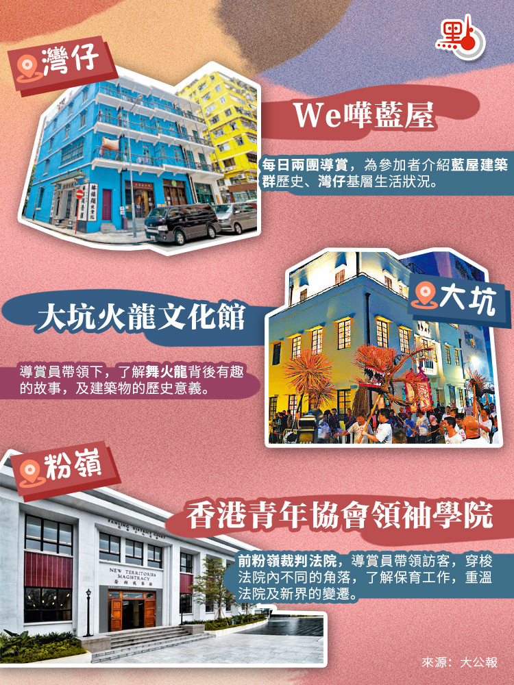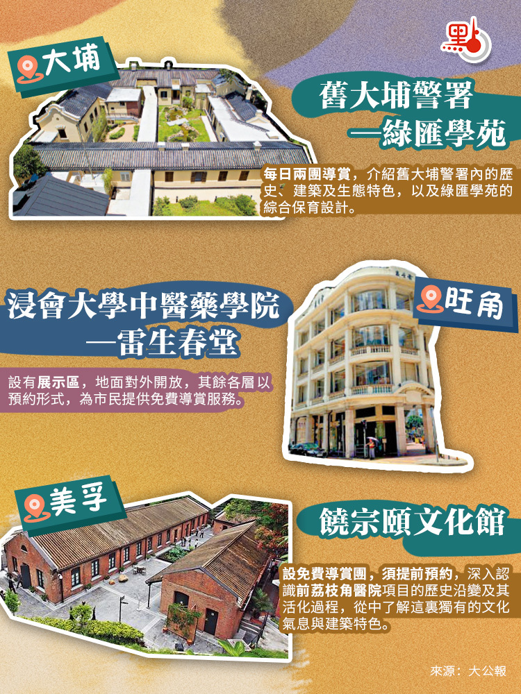 | 書館街12號 | 大坑火龍文化館 | 傳統民居 | 非物質文化遺產展覽館 | 香港銅鑼灣大坑書館街12號 | 首創歷史建築保育、非遺傳承、社區參與三合一活化模式,將百年孔聖義學建築轉化為國家級非遺的教育基地。 | 2805 0012 |