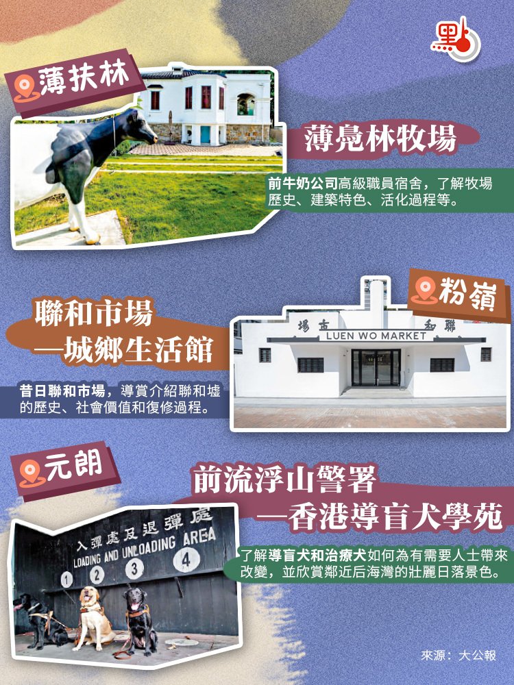 | 何東夫人醫局 | 嗇色園何東夫人醫局・生態研習中心 | 鄉村診所 | 生態教育中心 | 新界上水古洞路38號 | 展示了何東家族對古洞社區的影響力和貢獻,并紀念何東夫人對新界農業的貢獻。 | 6995 9873 |