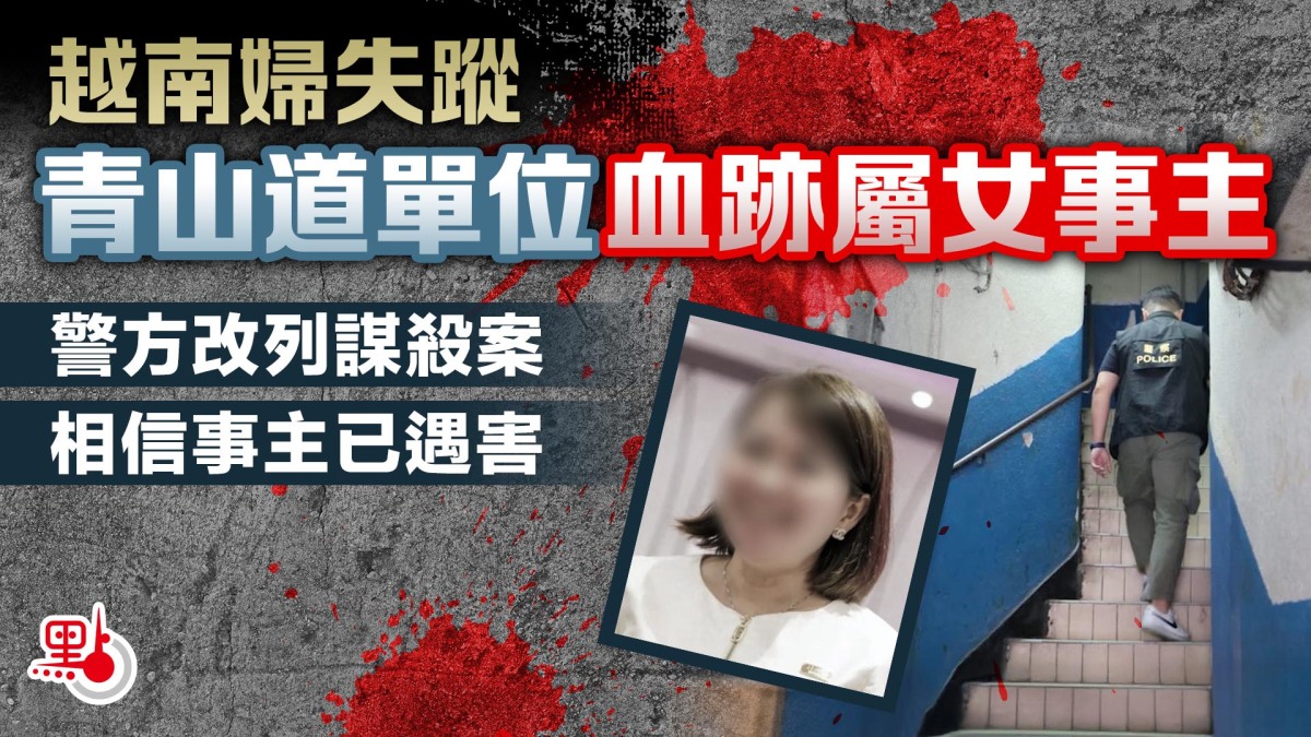 警方於6月21日晚上約8時接獲報案,指一49歲外籍女子於同日中午離開其位於旺角水渠道的住所後便告失蹤。警方經進一步調查後,相信該名女子失蹤前曾與一名懷疑涉案的外籍男子一同前往長沙灣青山道一單位。人員在該單位內發現血跡,經化驗後相信血跡屬於該名失蹤女子。警方有理由相信她已經遇害,並於今日將案件改列謀殺案。