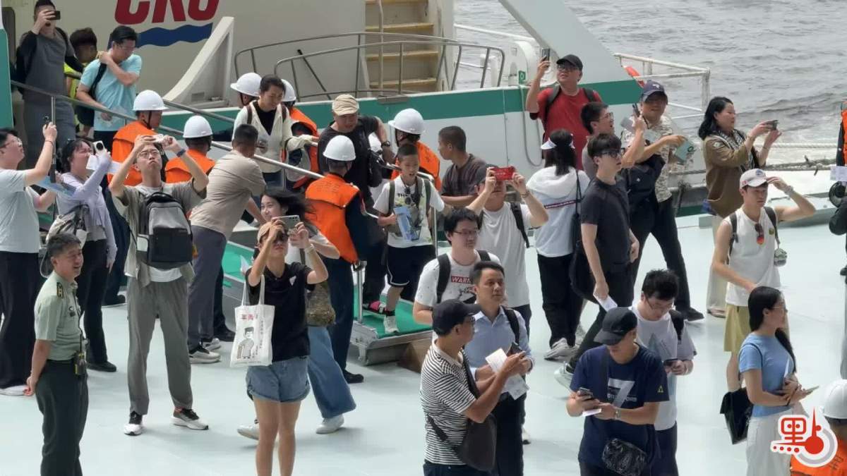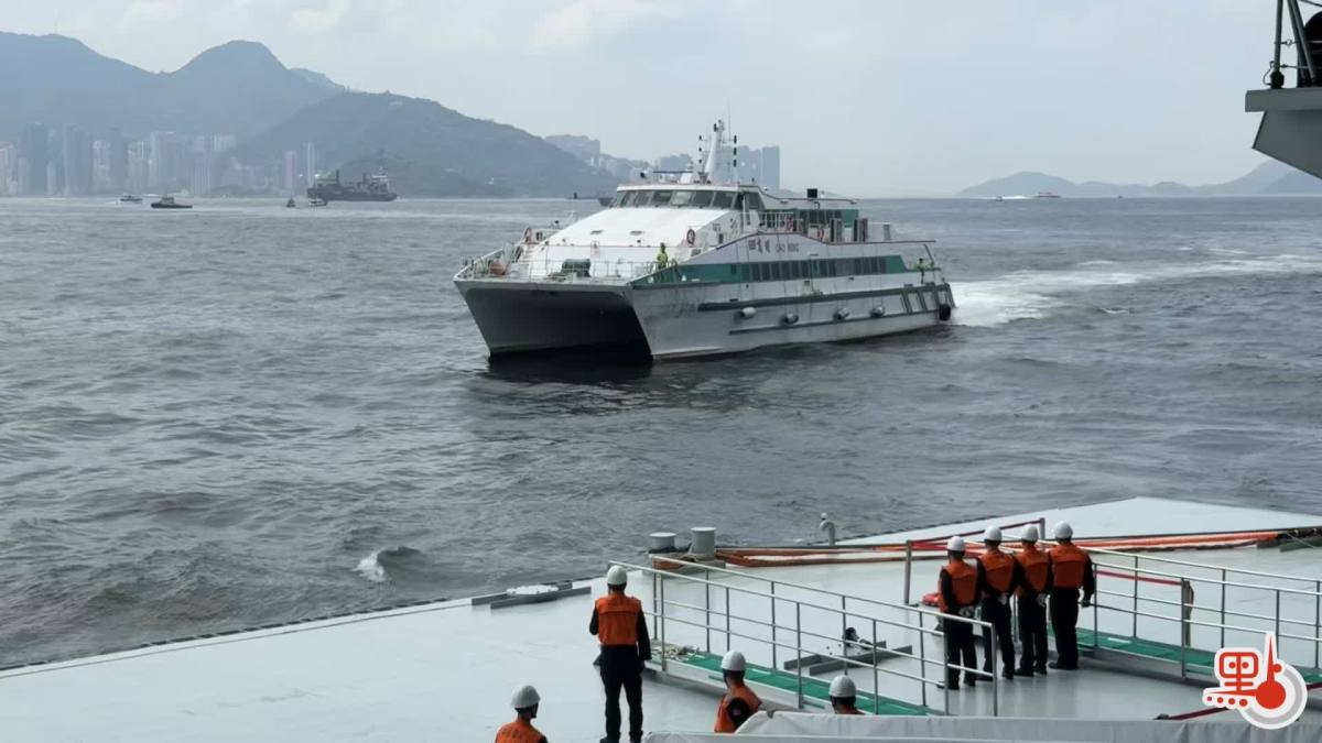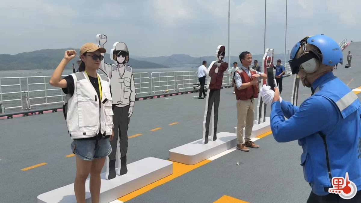 站在山東艦機庫門口,我的目光一直看向擺渡船來的方向。第一批準備登艦的香港市民乘坐擺渡船靠近山東艦時,已經能感受到他們的迫不及待——他們在擺渡船上就已經面向航母開始拍攝,舉起手機多角度記錄宏偉壯觀的航空母艦。擺渡船停定後,登艦的市民們難掩激動之情,有的市民更是小跑前進,只為早點進入山東艦打卡拍照,體驗航母上的各種互動環節。