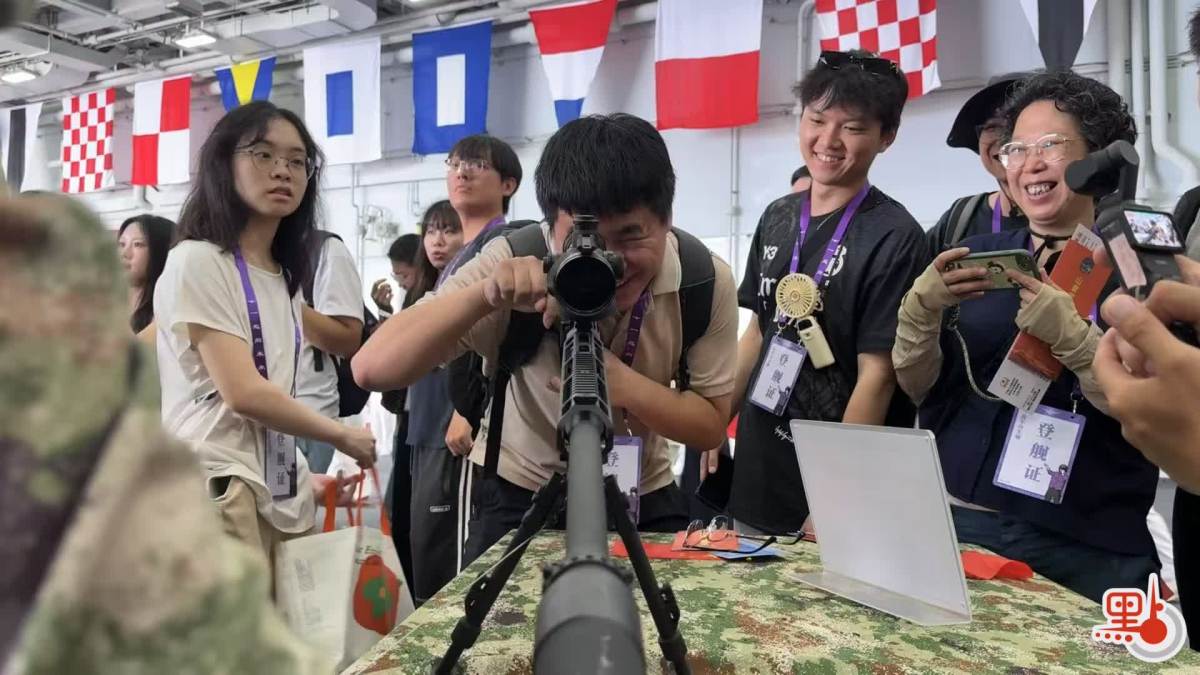 在引導員耐心引導下,大家很快就通過安檢,進入山東艦的機庫。有市民直奔歡迎台上拍照留念,也有市民在輕武器的展示區體驗武器裝備。每個武器裝備都配有講解員講解,而且市民還能「親自上陣」,體驗一把戰士的感覺。有一個值得注意的細節是,每當有市民體驗武器的時候,講解員都會用手捂住槍口作為保護,這樣的場景讓人覺得很貼心。