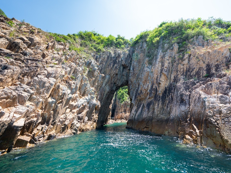 火石洲:穿越香港最高海蝕拱門「關刀洞」(因形似關公大刀得名)。