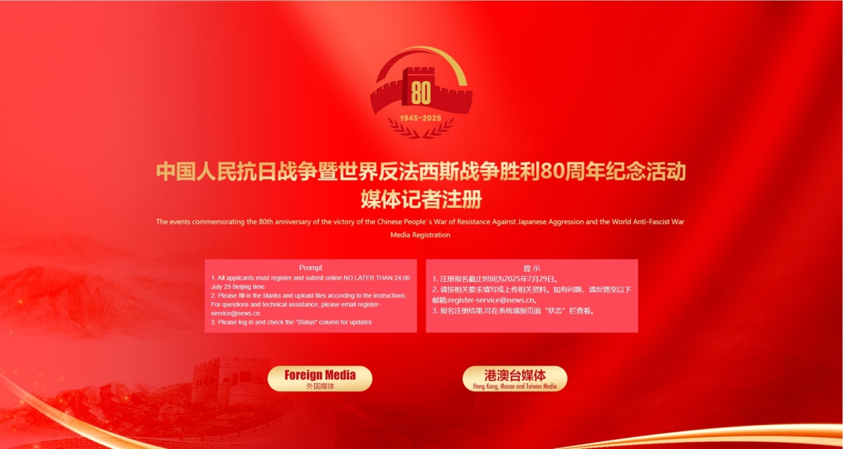據新華社報道,為方便外國媒體記者和港澳台媒體記者提交採訪申請,將開通記者報名註冊系統(http://kzjn80reg.zgjx.cn),歡迎外國媒體記者和港澳台媒體記者通過該系統提交報名註冊申請。採訪報名註冊申請受理時間自2025年7月15日起,至2025年7月29日止。