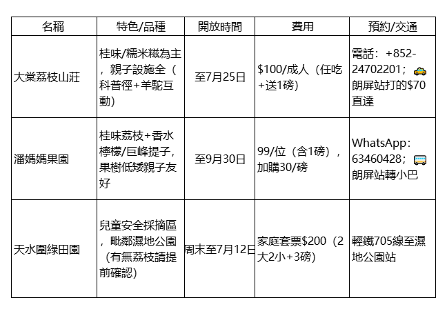 - 香港長效果園(如潘媽媽)可持續至9月,但荔枝季僅剩晚熟懷枝。