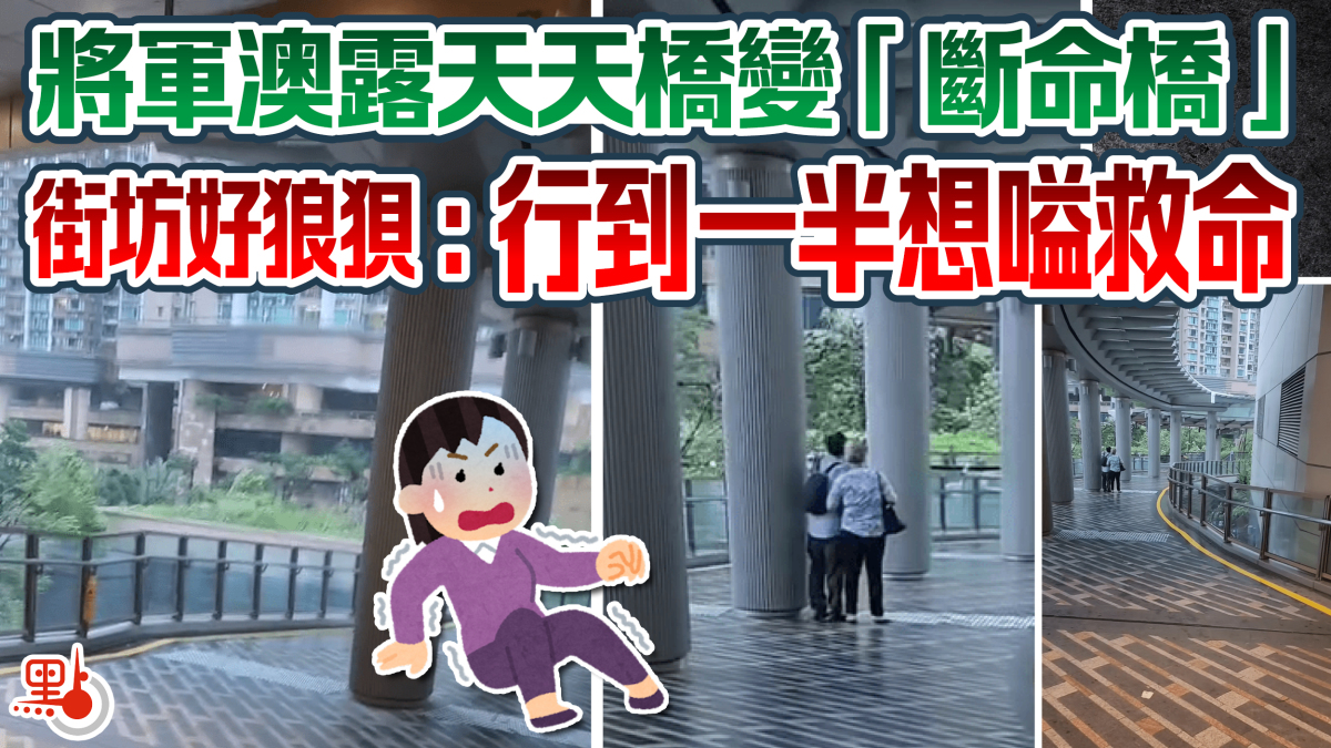 該名將軍澳民街坊在社交平台threads發文直指,「痴線,我屋企樓下好恐怖」。樓主表示,當時收工回家,便跟隨一對長者過橋,「我見前面對大D年紀都行,我咪跟。」然而,過程十分驚險,「行到一半想嗌救命,吹咗我走又跣又斜...我捉住d扶手,好狼狽。」