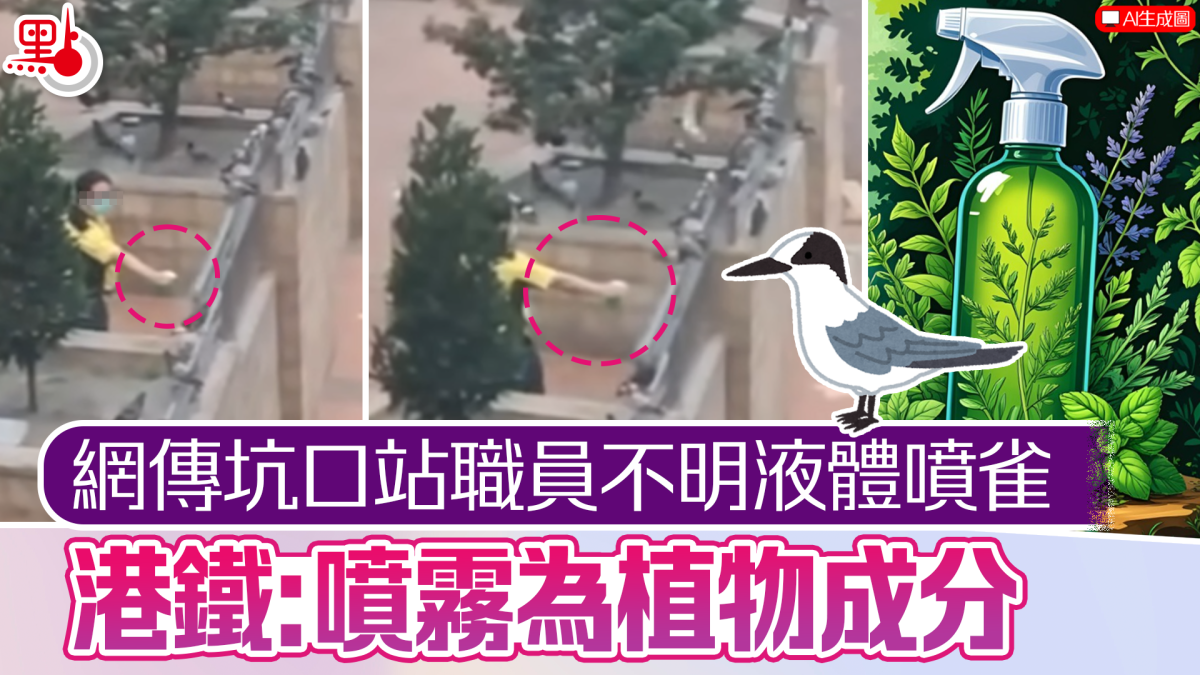 有本地保育團體上周六在社交平台上傳影片,顯示一名身穿港鐵制服的男子於坑口站b出口外,手持噴壺,先後向花槽邊、欄杆及一隻雀鳥頭部噴灑液體,合共至少20次,期間有雀鳥受驚飛離現場。