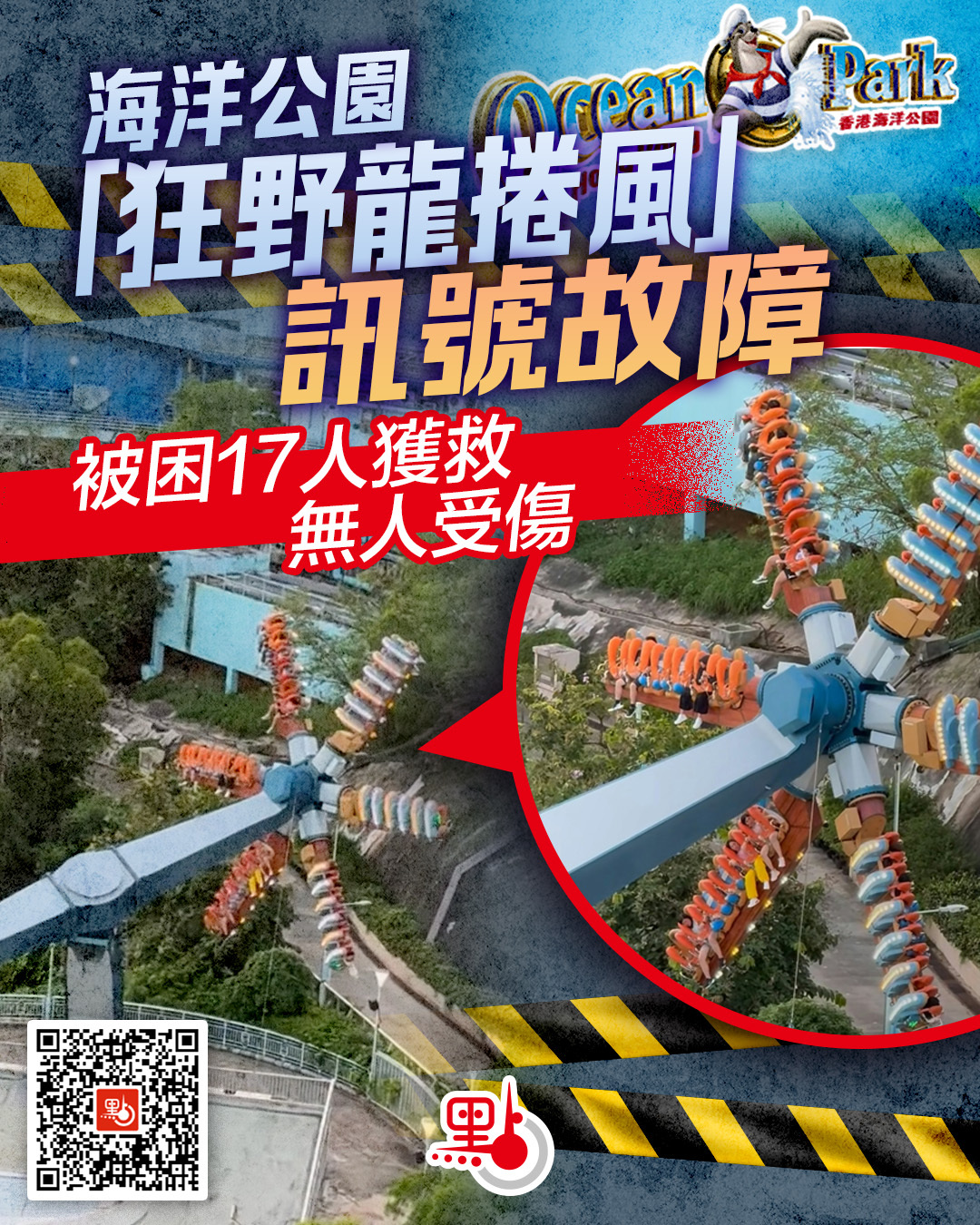 【點新聞報道】海洋公園機動遊戲「狂野龍捲風」今日(10日)下午突然停頓,有17人被困高處。警方傍晚6時許接獲海洋公園職員報案,指園內有機動遊戲突然停頓,多人被困,已派出救護車到場。海洋公園表示,被困的17人已全部獲救,無人受傷。