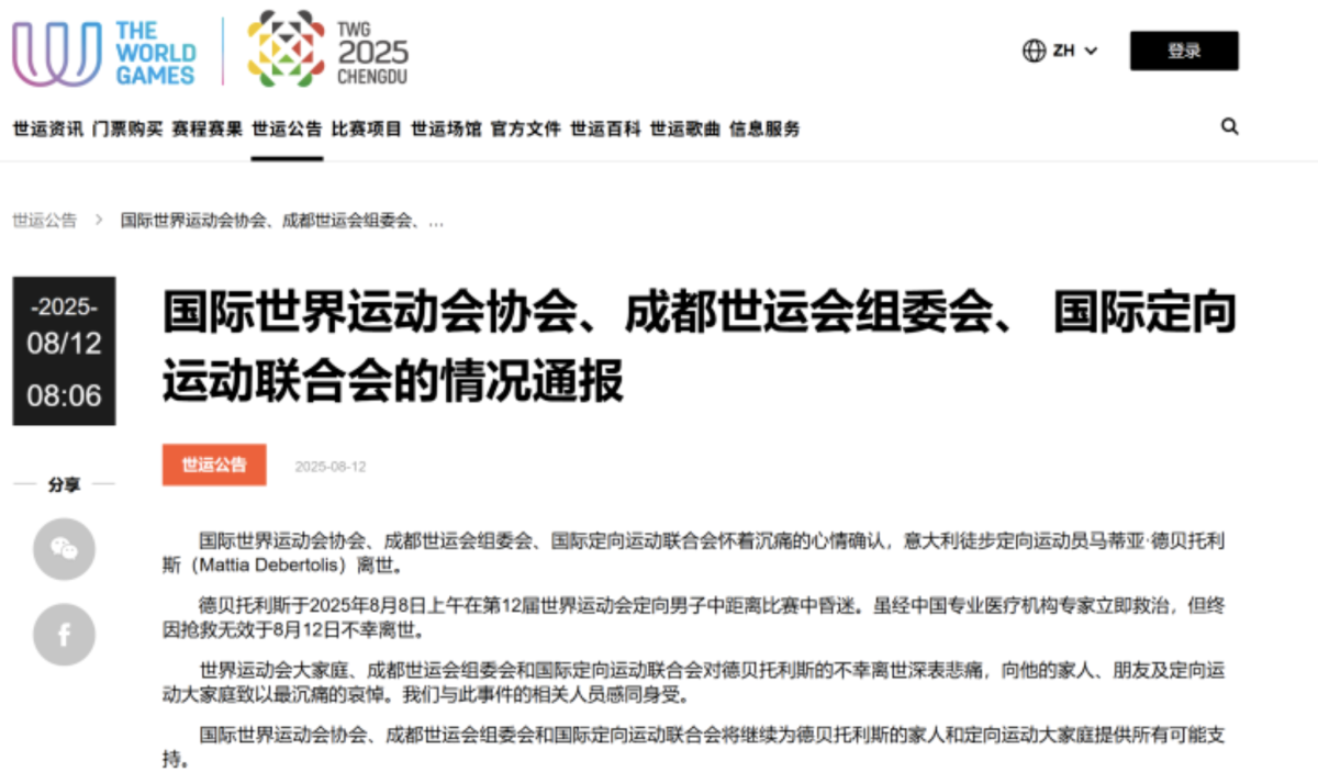 公告表示,世界運動會大家庭、成都世運會組委會和國際定向運動聯合會對德貝托利斯的不幸離世深表悲痛,向他的家人、朋友及定向運動大家庭致以最沉痛的哀悼。