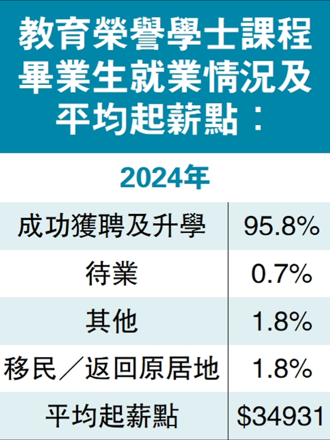 是次就業調查亦訪問了489名就讀「教育相關學科課程」的畢業生,包括創意藝術與文化榮譽文學士、語文研究榮譽文學士、特殊教育榮譽文學士、人工智能與教育科技榮譽理學士、行政管理榮譽理學士、綜合環境管理榮譽理學士及心理學榮譽社會科學學士。當中86.3%受訪畢業生成功獲聘或選擇繼續進修,就業平均起薪點為20570元。