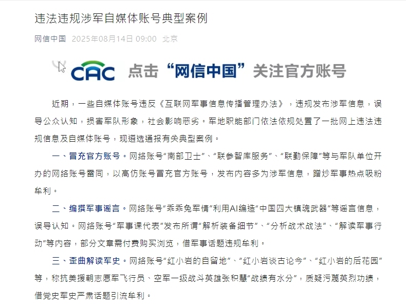 【點新聞報道】8月14日,「網信中國」微信公眾號通報一批違法違規涉軍自媒體賬號典型案例。