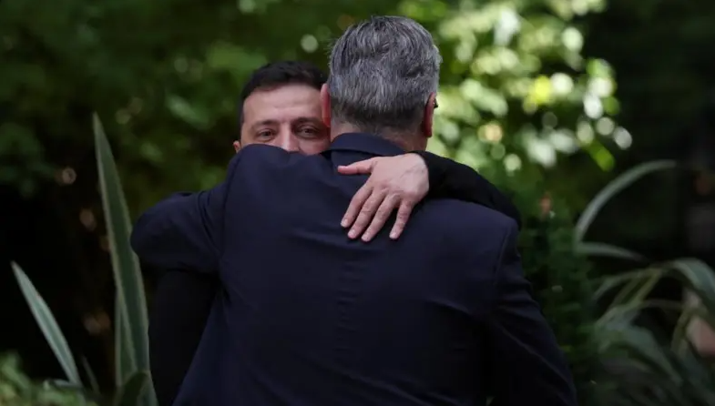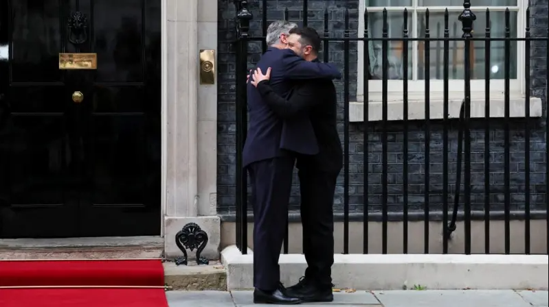 據BBC報道,英國為澤連斯基的抵達在唐寧街10號鋪設了紅地毯,並拍到他與首相一起漫步在唐寧街玫瑰園。兩位領導人均未對等候的記者發表任何評論,而是在走進屋內之前擁抱握手。