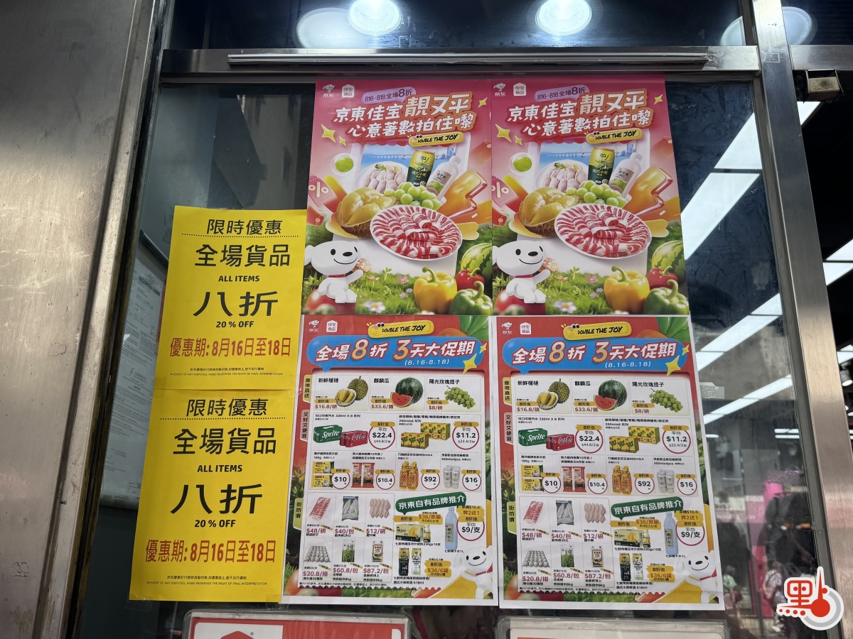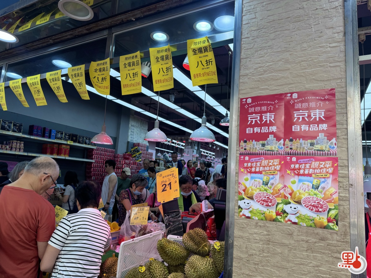 收購完成後,京東佳寶超市今日(16日)起舉行為期三日的全場8折大促活動,將涵蓋首批數十款京東供應鏈商品,未來京東供應鏈商品將持續登陸香港。記者今日上午走訪紅磡民泰街的佳寶超市看到,店內外已張貼「京東佳寶靚又平」、「全場貨品8折」的海報,不少市民已經採購完畢、滿載而歸,店內亦有眾多市民正在挑選商品和排隊等待付款。