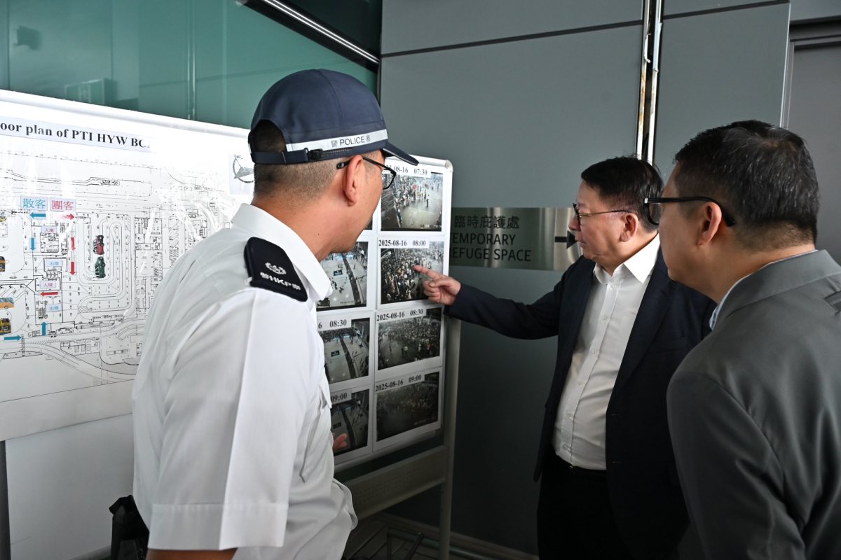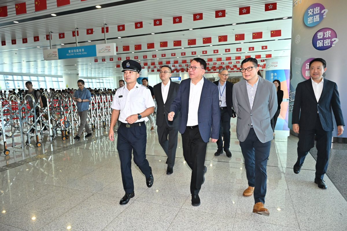 【點新聞報道】正值暑假旅遊旺季,來往香港與內地以至海外的人數節節上升。今年7月,訪港旅客達439萬人次,較去年同期升12%。上周日(8月10日)的總出入境人次更創歷史新高,達134萬人次。政務司司長陳國基今早(16日)在保安局局長鄧炳強、入境處處長郭俊峯、海關關長陳子達,以及警務處同事的陪同下,到訪了香園圍管制站,檢視口岸部門應對出入境人流上升的各項安排和運作。