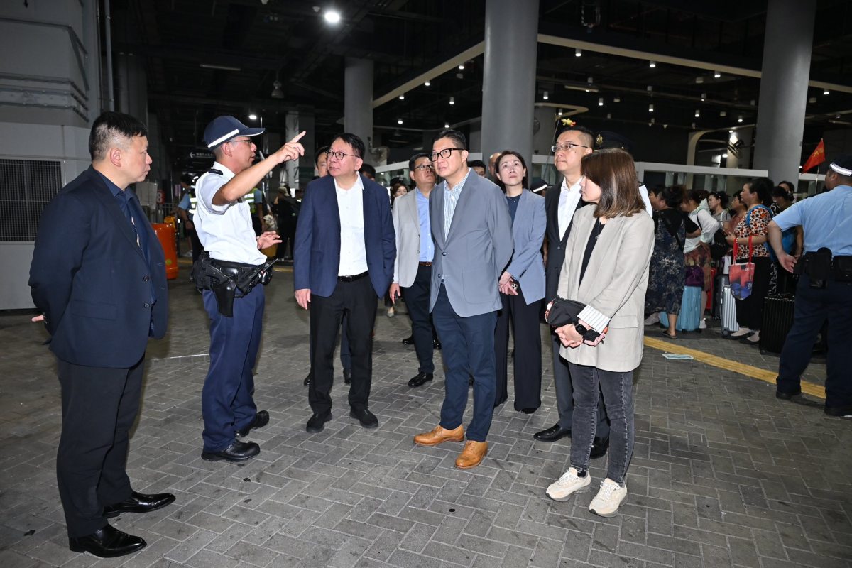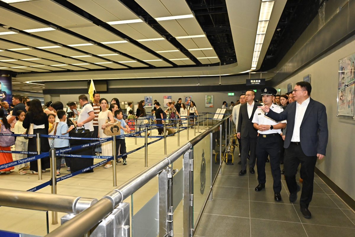 香園圍管制站作為第一個「人車直達」的管制站,自2023年2月開始客運通關服務後,一直深受市民和內地訪客歡迎,通關人次屢創新高。今日現場可見,雖出境和入境大廳人流頻密,但整體過關暢順、秩序井然,不論出境和入境的旅客的等候時間都少於15分鐘。陳國基肯定了前線人員在清關、疏導人流、維持秩序等方面的高效、辛勤工作,亦感謝旅客的配合。