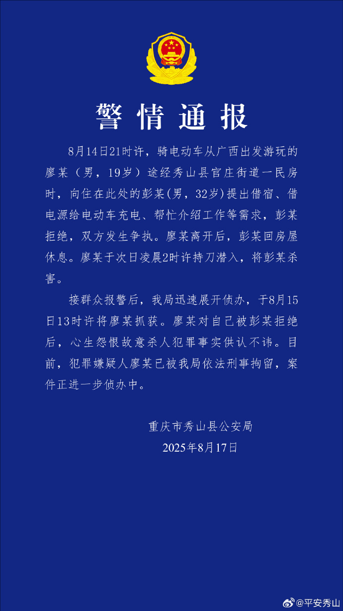 【點新聞報道】據重慶市秀山縣公安局通報,8月14日21時許,騎電動車從廣西出發遊玩的廖某(男,19歲)途經秀山縣官莊街道一民房時,向住在此處的彭某(男,32歲)提出借宿、借電源給電動車充電、幫忙介紹工作等需求,彭某拒絕,雙方發生爭執。廖某離開後,彭某回房屋休息。廖某於次日凌晨2時許持刀潛入,將彭某殺害。