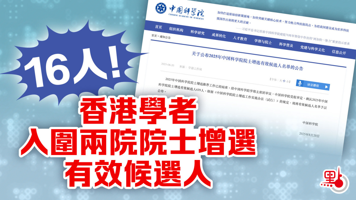 點新聞記者翻閱候選人名單,發現其中有約14名科學院院士有效候選人來自港校,包括香港大學、香港中文大學、香港理工大學、香港中文大學(深圳)、香港城市大學、香港中文大學(深圳)國際眼科研究所,及香港科技大學。
