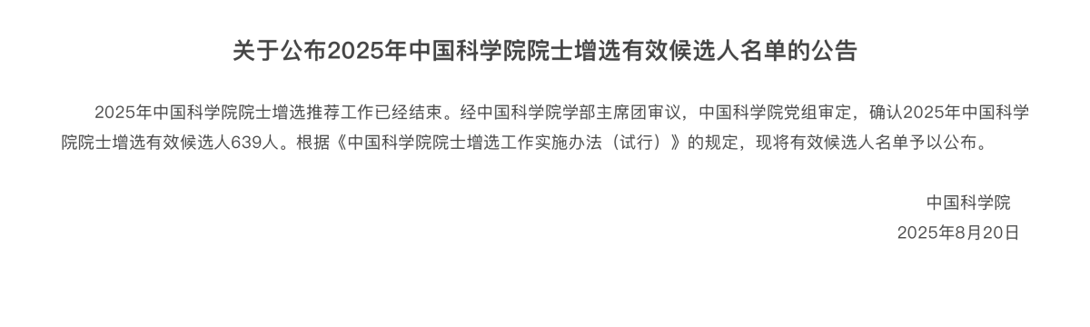 院士制度是黨和國家為樹立尊重知識、尊重人才導向,凝聚優秀人才服務國家設立的一項重要制度。院士增選每兩年進行一次,2025年兩院院士增選工作於4月25日啟動,中國科學院院士、中國工程院院士增選名額各不超過100名。昨日(20日)兩院公布入圍院士增選有效人選,此後將進行外部同行專家評選、院士增選大會選舉,選出新增選院士。