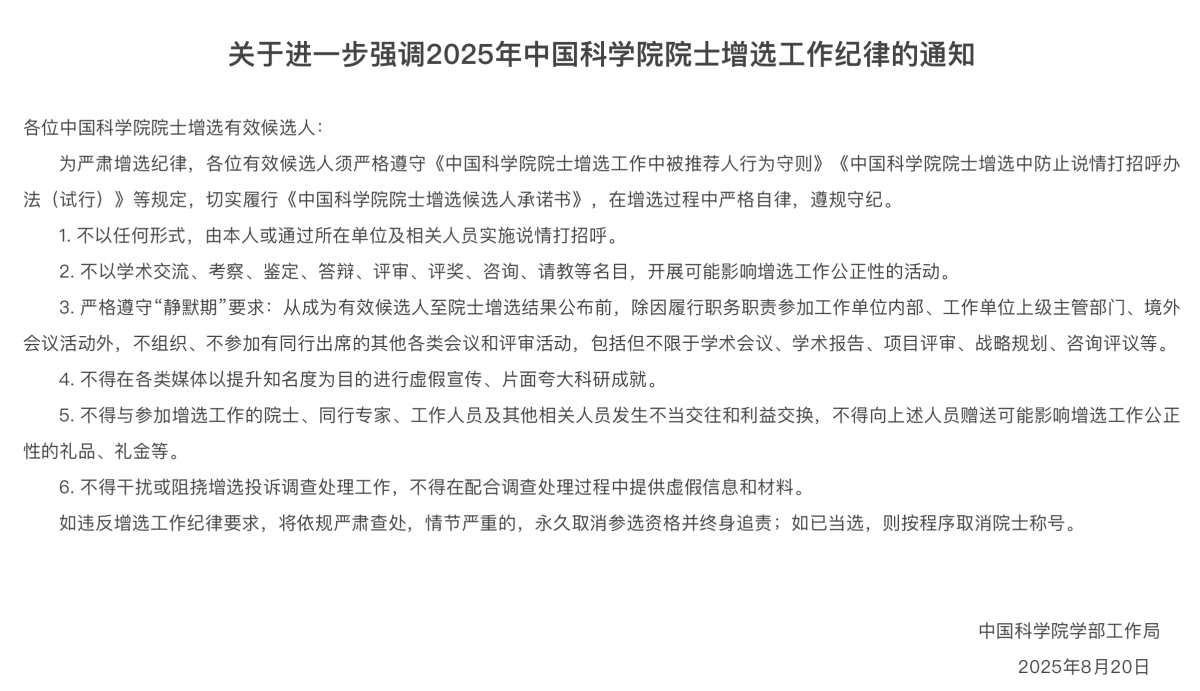 中國科學院、中國工程院兩院再次強調了院士增選的工作紀律。中國科學院指出,有效候選人須嚴格遵守「靜默期」要求,從成為有效候選人至院士增選結果公布前,除因履行職務職責參加工作單位內部、工作單位上級主管部門、境外會議活動外,不組織、不參加有同行出席的其他各類會議和評審活動,包括但不限於學術會議、學術報告、項目評審、戰略規劃、諮詢評議等。此外,不得在各類媒體以提升知名度為目的進行虛假宣傳、片面誇大科研成就。