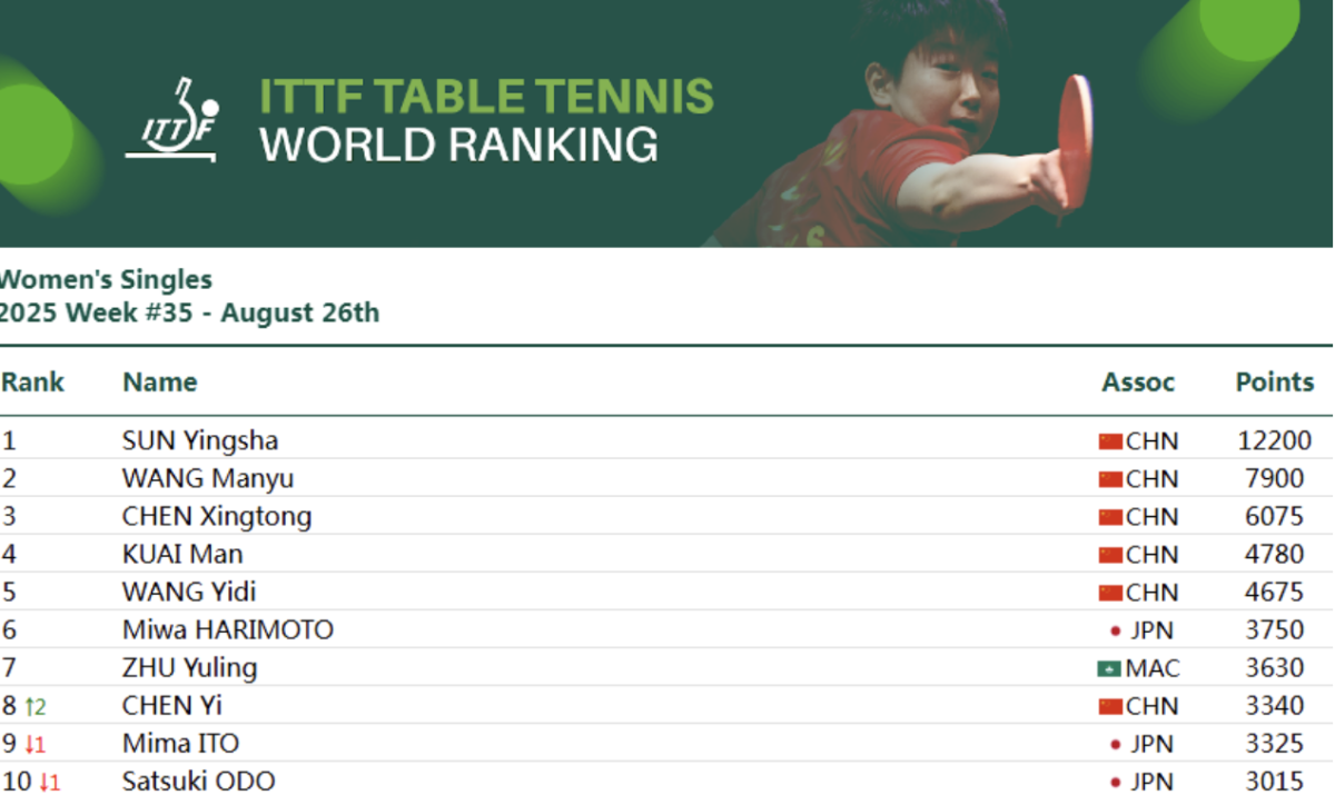 本周更新世界排名後,中國在女單方面表現亮眼,包攬前五名。孫穎莎12200分斷層領先位列第一,王曼昱7900分位列第二,陳幸同、蒯曼和王藝迪分列三至五位,第六位到第十位分別是張本美和、朱雨玲、陳熠、伊藤美誠和大藤沙月。