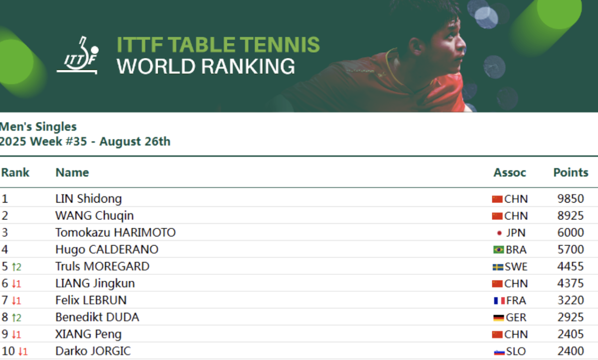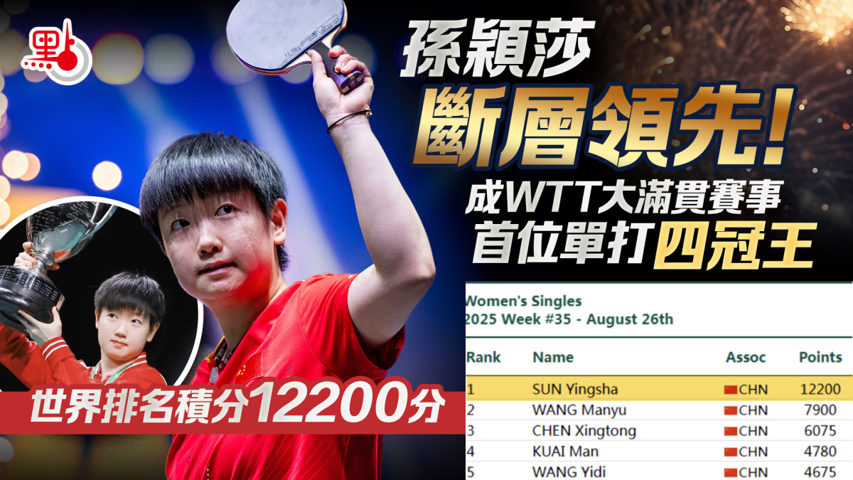 【點新聞報道】8月26日,國際乒聯更新了2025年第35周的世界排名。其中,孫穎莎在WTT歐洲大滿貫瑞典站女單奪冠後,成為WTT大滿貫賽事首位單打四冠王,也成為乒乓球史上首位世界排名積分突破12000分的運動員。