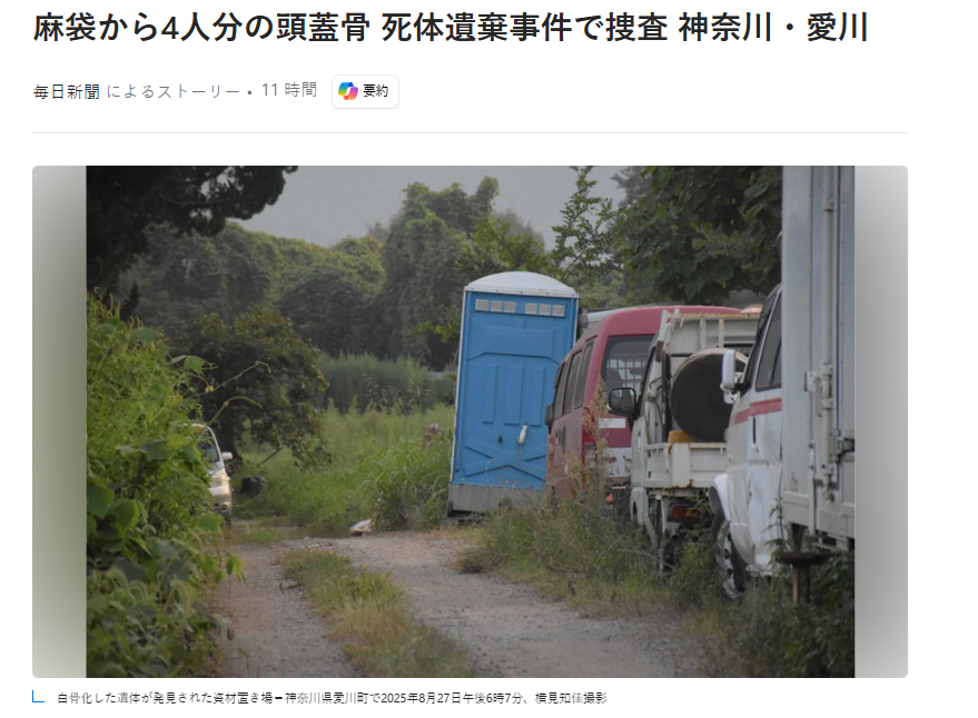 據調查人員透露,8月19日下午5時許,管理該資材堆放場的一名男性發現4個非法丟棄的麻袋。檢查袋內後,發現疑似人骨的物品,隨即前往警方厚木署高峰駐在所報案。據推測,4個頭蓋骨中3個屬於男性,1個屬於女性,部分骨頭上還附着類似泥土的物質。