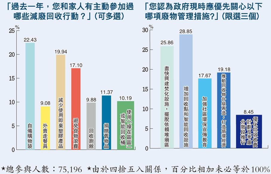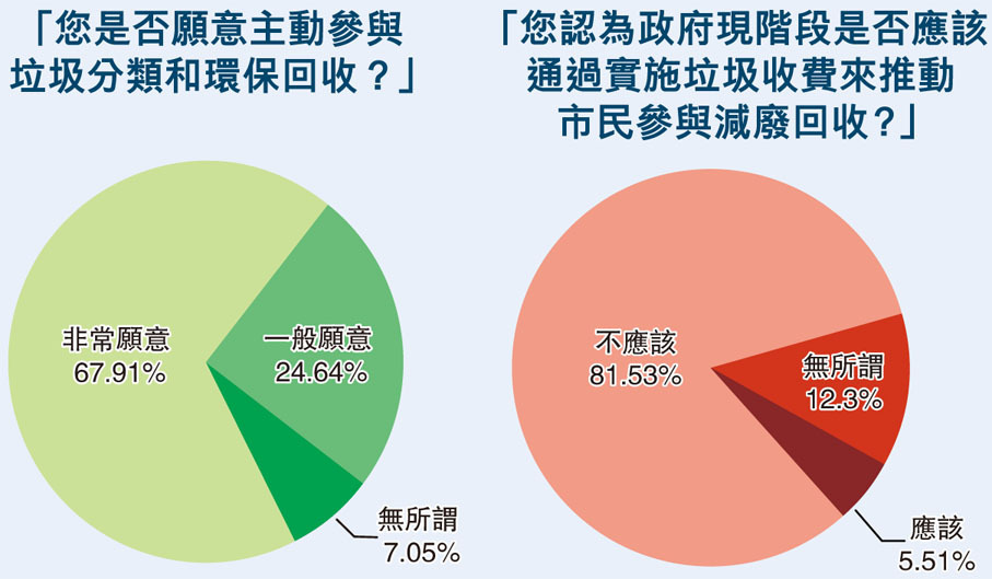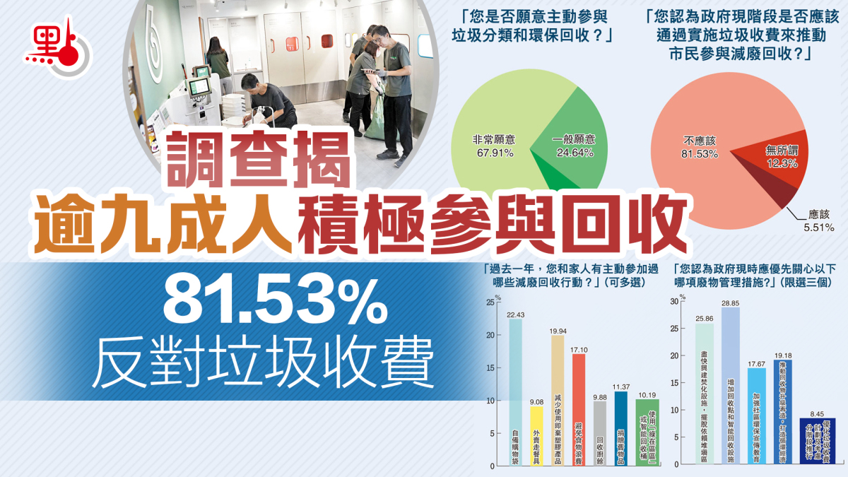 調查亦顯示,有81.53%受訪者認為現階段不應該推行垃圾收費,並優先支持政府增設回收點(28.85%)及興建焚化設施(25.86%),僅8.45%關注優化垃圾收費計劃。