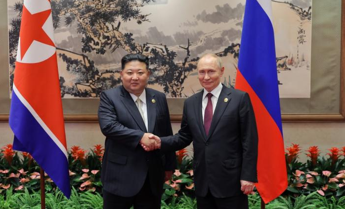 據中新社援引朝中社報道,金正恩與普京的會晤「始終在友好的氣氛中舉行」,金正恩為紀念與普京在北京會晤,同他合影。金正恩表示,「與普京總統重逢,感到高興」,並充分肯定兩國關係在朝俄兩國條約條款簽訂後積極擴展到各領域。