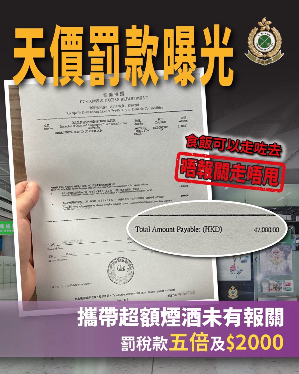 【點新聞報道】香港海關今日(4日)在社交平台發文,並附上一張「天價罰款」,相片中可見,有市民因攜帶超額煙酒入境本港未有報關,遭罰稅款5倍及2000港幣,最終要支付4.7萬港幣罰款。該帖文又指出,「食飯可以走數,帶了超額煙酒入境香港就沒有這麼容易走數!走私漏稅一定衰,不要以為可以脫身。」